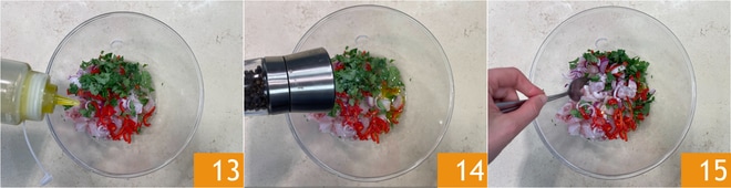 Adicione tudo ao robalo, tempere com azeite 13, sal e pimenta 14 e misture delicadamente 15. Cubra com filme plástico e deixe marinar na geladeira por 15-20 minutos para que os sabores se integrem.