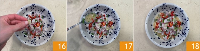 Emprate, decorando com folhas de coentro fresco e fatias de lima 16, complete com uma colher da marinada 17. O ceviche de robalo está pronto para ser servido 18.