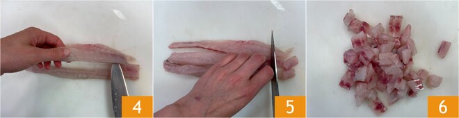 Corte os filés de robalo primeiro em tiras 4 e depois em cubos de tamanhos uniformes 5 6.