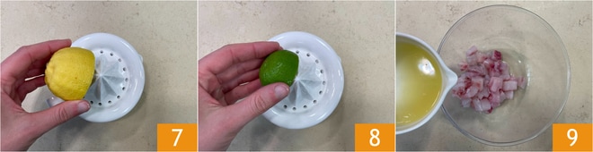 Esprema o limão 7 e a lima 8 e despeje o suco sobre os cubos de robalo 9.