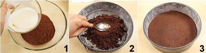Para preparar a cheesecake de triplo chocolate, comece preparando a base: coloque os biscoitos de cacau no processador e triture-os finamente. Coloque a manteiga para derreter em uma panela; enquanto isso, coloque os biscoitos triturados em uma tigela e adicione aos poucos a manteiga derretida 1, misturando bem tudo. Unte uma forma, de preferência com aro removível, com 22 cm de diâmetro; neste ponto, você pode forrar a forma com papel manteiga: corte um disco de papel manteiga do mesmo diâmetro da base da forma e duas tiras da mesma altura das bordas, depois forre a própria forma. Despeje os biscoitos triturados na forma coberta com papel manteiga 2 e, com a ajuda de uma colher, compacte bem a base de biscoito 3. Deixe esfriar na geladeira por meia hora ou no freezer por cerca de dez minutos.
