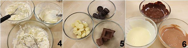 Agora dedique-se ao recheio: prepare três tigelas para os três cremes e coloque em cada uma 250 g de cream cheese, mexa para amaciar 4. Enquanto isso, derreta em banho-maria (ou no micro-ondas) os 3 tipos de chocolate separadamente (5-6).