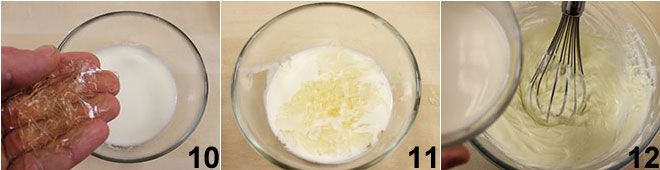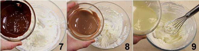 Agora pegue três tigelas e amoleça a gelatina necessária para cada creme (3 g) separadamente em água fria por 10 minutos. Em seguida, pegue outras 3 tigelas e despeje em cada uma 80 ml de creme de leite, que você já aquecerá previamente, e em cada uma dissolva a gelatina bem espremida (3 g para cada tigela) (10-11). No final, você deverá obter 3 tigelas, cada uma contendo 80 ml de creme de leite e 3 g de gelatina dissolvida. Incorpore o primeiro dos 3 compostos de creme de leite e gelatina ao chocolate branco usando um batedor 12.