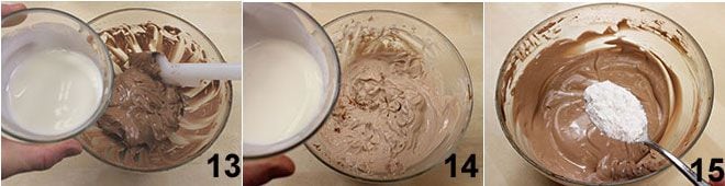 Faça a mesma operação para as outras tigelas de creme de leite e gelatina, incorporando-as tanto no chocolate ao leite quanto no amargo (13-14). Por último, adicione o açúcar de confeiteiro, mexendo com uma espátula 15.