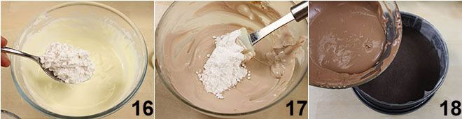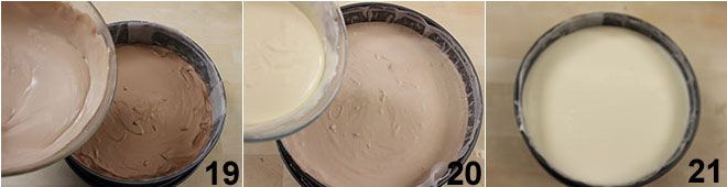 Faça a mesma operação para todos os tipos de chocolate (16-17). Agora que os cremes estão prontos, você pode montar a cheesecake, retire da geladeira a base de biscoito já fria e compacta, comece a despejar primeiro o creme de chocolate amargo 18, deixe descansar na geladeira ou no freezer por 15-20 minutos.