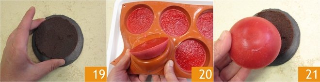 Quando todas as partes estiverem prontas, monte a cheesecake: coloque os discos de biscoito em um prato de servir, removendo os aros de metal 19, depois retire delicadamente as semiesferas de framboesa 20 e coloque-as sobre a base 21.