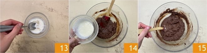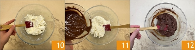 Misture com uma espátula para incorporá-los 10. Derreta o chocolate como feito anteriormente e adicione à mistura 11. Misture até que esteja homogêneo 12.