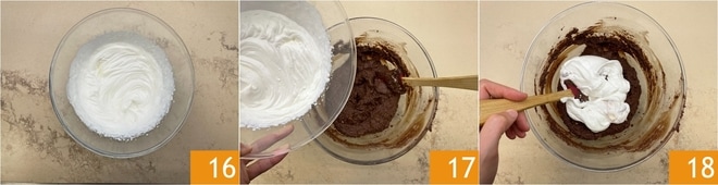Agora bata 200 g de creme de leite 16. Despeje na mistura 17 e misture bem com a espátula 18.