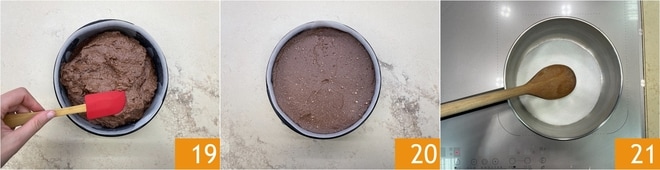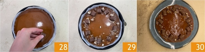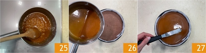 Misture bem 25 e reserve. Quando o molho de caramelo estiver frio, despeje sobre a cheesecake 26. Nivele novamente a superfície com uma espátula 27.
