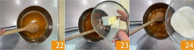 Deixe o açúcar derreter completamente, girando ocasionalmente a panela ou mexendo com uma colher de pau 22. Assim que obtiver um caramelo âmbar, adicione a manteiga 23, abaixe o fogo e misture. Adicione meia colher de chá de sal e misture novamente. Quando começar a ferver, desligue o fogo. Adicione também o creme de leite, de preferência quente 24.