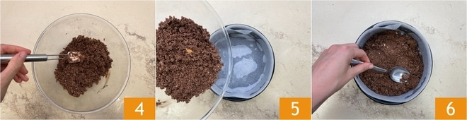 Para preparar a cheesecake com chocolate e caramelo salgado, comece pela base. Coloque os biscoitos secos em um mixer 1 e triture até reduzi-los a pó 2. Transfira-os para uma tigela e adicione o chocolate derretido em banho-maria ou no micro-ondas 3.
