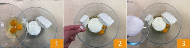 Para preparar a cheesecake assada com o tvorog, primeiro derreta a manteiga e deixe esfriar. Coloque em uma tigela grande o queijo tvorog, os ovos 1, o sal 2 e o açúcar 3.