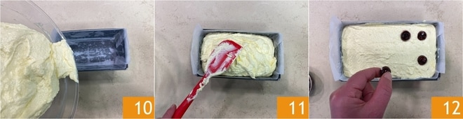 Despeje a mistura em uma forma de plumcake de 25x11x7 cm forrada com papel manteiga 10 e nivele a superfície 11. Insira as cerejas em calda em duas fileiras a uma distância regular pressionando levemente 12.