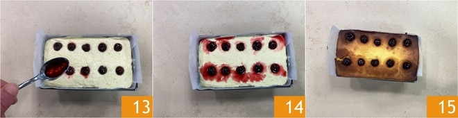 Complete regando as cerejas com a sua calda 13 e bata a forma na bancada para eliminar possíveis bolhas de ar 14. Asse a cheesecake na prateleira do meio do forno estático por 60 minutos a 180°, colocando no fundo do forno um recipiente com água quente para garantir a umidade adequada durante o cozimento. Após o tempo de cozimento, abra levemente a porta do forno e deixe a cheesecake esfriar completamente dentro dele antes de desenformar 15. Uma vez resfriada, coloque a cheesecake assada com o tvorog na geladeira por pelo menos 3 horas antes de servir!