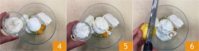 Adicione também o creme de leite azedo 4 e o amido de milho 5, depois rale a casca do limão 6.