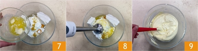 Por fim, adicione a manteiga derretida e esfriada 7 e bata com o mixer de imersão 8 até obter uma mistura homogênea 9.