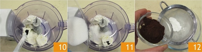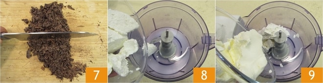 Enquanto isso, prepare o creme: pique o chocolate amargo com uma faca 7 e derreta em banho-maria ou no micro-ondas, depois deixe esfriar. Enquanto isso, coloque a ricota 8 e o cream cheese 9 em um processador.