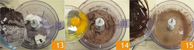 Adicione também os pós 13 e ligue o processador para misturar tudo. Adicione os ovos 14 e bata novamente, depois despeje o chocolate derretido e morno 15.