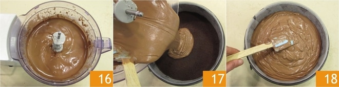 Ligue novamente o processador até obter uma mistura espessa e homogênea 16. Neste ponto, pegue a forma com a base de biscoitos e despeje o creme dentro 17, depois nivele a superfície 18. Asse em forno estático pré-aquecido a 165°C por 60 minutos, inserindo no forno uma panela pequena com um pouco de água para criar a umidade correta: assim é menos provável que se formem rachaduras durante o cozimento ou o endurecimento. Uma vez assada, retire do forno e deixe esfriar na forma, depois transfira para a geladeira por pelo menos 2 horas.