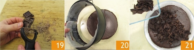 Enquanto isso, crie as raspas de chocolate amargo para a decoração com a ajuda de um descascador de legumes 19 e mantenha-as frescas até o momento de usar. Após o tempo de endurecimento, remova a forma 20 e decore com as raspas de chocolate: sua cheesecake de chocolate está pronta para ser servida 21!
