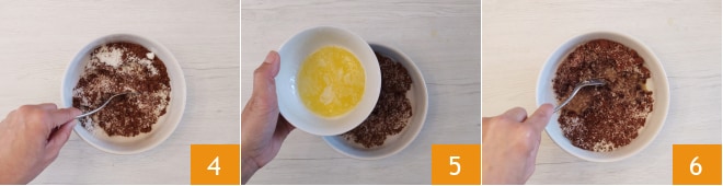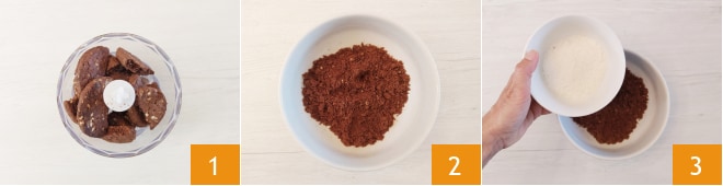 Para preparar o cheesecake de coco e Nutella, comece untando e forrando com papel manteiga uma forma de 18 cm de diâmetro. Prossiga preparando a base: derreta a manteiga em fogo bem baixo, depois triture os biscoitos no processador 1, transfira a farinha para uma tigela 2 e adicione o coco ralado 3.