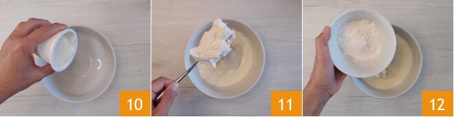 Despeje em uma tigela o iogurte de coco 10, adicione o queijo cremoso 11 e o açúcar de confeiteiro 12.