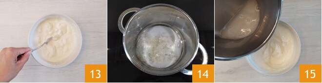 Misture para incorporar todos os ingredientes 13. Neste ponto, escorra a gelatina e coloque-a em uma panela junto com o leite de coco 14, derreta em fogo baixo mexendo continuamente. Despeje sobre o creme 15.
