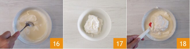 Misture bem 16 e bata o creme de leite até formar picos firmes 17. Em seguida, adicione ao creme 18.