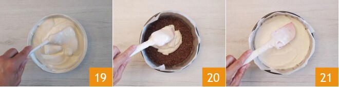 Certifique-se de incorporá-lo delicadamente, fazendo movimentos suaves de baixo para cima 19. Transfira tudo para a base de biscoitos 20 e nivele a superfície 21.