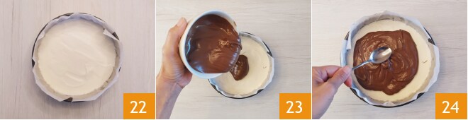 Coloque o doce para endurecer na geladeira por pelo menos 2 horas (melhor 3 ou 4 horas para que fique bem firme) 22. Após esse tempo, retire o doce da geladeira, despeje a Nutella em uma tigela e mexa com uma colher para amolecê-la. Em seguida, despeje sobre a superfície do doce 23 e espalhe uniformemente com as costas de uma colher 24.