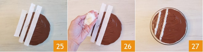 Coloque delicadamente três tiras de papel manteiga, ligeiramente espaçadas entre si, em uma das bordas do doce 25, deixe cair o coco ralado 26 e está pronto o seu cheesecake de coco e Nutella 27.