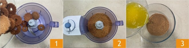 Para preparar o cheesecake de maracujá, coloque os biscoitos no processador 1 e triture-os finamente 2. Despeje a mistura em uma tigela e adicione a manteiga derretida 3.
