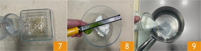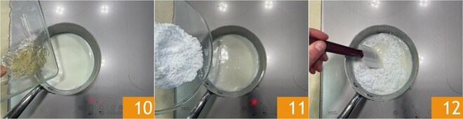 Derreta a gelatina amolecida 10 e adicione o açúcar 11, misture para integrar 12.