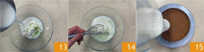 Despeje a mistura na tigela 13 e mexa 14. Retire a base da geladeira e preencha o anel com o creme 15.