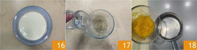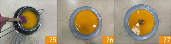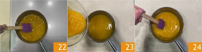 Misture para integrar 22, uma vez que a gelatina esteja derretida, despeje o purê de maracujá 23 e misture 24.