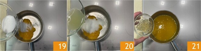 Tempere com o açúcar 19 e o suco de limão 20. Aqueça a mistura e incorpore a gelatina espremida 21.