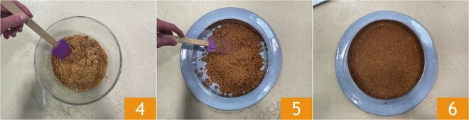 Misture para integrar 4. Despeje a mistura em um anel de 24 cm de diâmetro colocado em um prato de servir 5, pressione bem com as costas de uma colher para distribuir e compactar a base 6. Coloque na geladeira por 30 minutos.