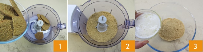 Para fazer o cheesecake de morangos, comece preparando a base: derreta a manteiga em fogo baixo e deixe esfriar. Coloque os biscoitos no processador 1 e triture até obter uma mistura arenosa 2. Transfira os biscoitos para uma tigela, despeje a manteiga derretida e esfriada 3 e misture para incorporar.