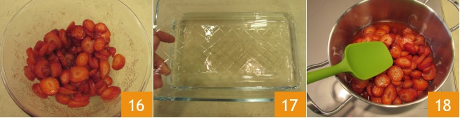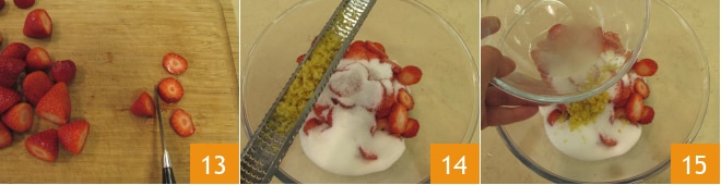 Após 3 horas, lave os morangos e corte-os em fatias de 2-3 mm 13, adicione o açúcar, a casca de limão 14 e seu suco 15.
