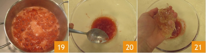 Cozinhe por 5 minutos em fogo alto 19. Em seguida, desligue o fogo, retire 3-4 colheres de sopa de suco de morango quente e despeje em uma tigela 20, dissolva aqui a gelatina amolecida e escorrida 21.