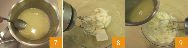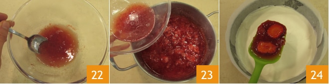 Misture até que esteja completamente dissolvido 22, depois despeje na panela com o restante da mistura 23. Deixe esfriar e despeje o coulis de frutas sobre o creme do cheesecake 24.