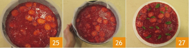Nivele bem a superfície com a espátula 25 e coloque na geladeira por 1-2 horas. Após o tempo de resfriamento 26, desenforme o cheesecake e decore com folhas de hortelã fresca. O cheesecake de morangos sem glúten está pronto para ser servido.