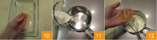 Enquanto isso, prepare o creme. Coloque a gelatina de molho em água fria 10 e, enquanto isso, aqueça o creme de leite em uma panela, mas sem deixá-lo ferver 11. Assim que estiver suficientemente quente, escorra a gelatina e mergulhe-a no creme de leite. Misture bem com um batedor, tomando cuidado para não deixar grumos: se isso acontecer, basta colocar novamente no fogo por um momento 12.
