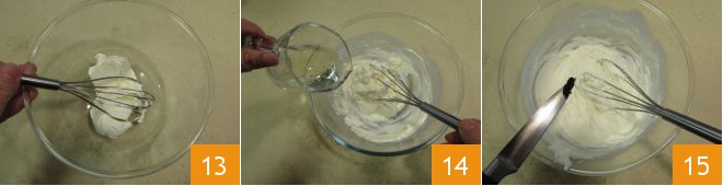 Enquanto a mistura esfria, coloque o queijo fresco em outra tigela e trabalhe-o por alguns instantes com um batedor 13. Em seguida, adicione o prosecco 14, as sementes extraídas da vagem de baunilha 15