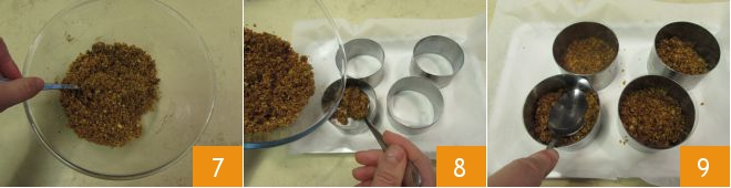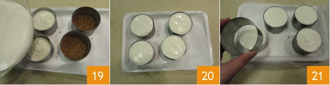 e misture 7. Transfira a mistura para 4 formas com 7,5 cm de diâmetro e 4,5 cm de altura colocadas em uma bandeja com papel manteiga. Além disso, cuide de revestir a circunferência com papel acetato ou papel manteiga 8. Alise bem com as costas de uma colher e leve à geladeira por 30 minutos 9.