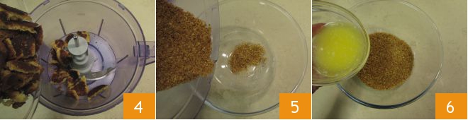 Transfira os pedaços para o processador e obtenha migalhas bem pequenas ao acionar as lâminas 4. Despeje-os em uma tigela 5, adicione a manteiga derretida 6