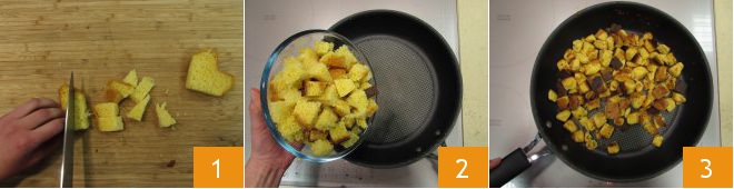 Para preparar o cheesecake de prosecco, comece pela base feita de pandoro. Corte-o em pedaços de 1-2 cm 1 e coloque-os em uma frigideira antiaderente. Cozinhe os pedaços de pandoro por 7-8 minutos em temperatura média, mexendo frequentemente 2, assim evitará que queimem. Na verdade, o pandoro deve ficar apenas seco, dourado e bem tostado 3.