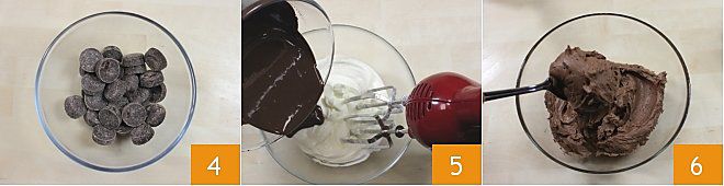 Agora dedique-se à preparação do creme de chocolate: coloque as gotas de chocolate amargo em uma tigela e coloque a tigela dentro de uma panela preenchida com água até a metade. Cozinhe em banho-maria o chocolate, mantendo o fogo bem baixo até que esteja completamente derretido 4. Enquanto isso, coloque em uma tigela o cream cheese e 25 g de açúcar de confeiteiro e bata até obter um composto espumoso. Nesse ponto, adicione o chocolate amargo derretido depois de deixá-lo esfriar 5 e misture tudo 6.