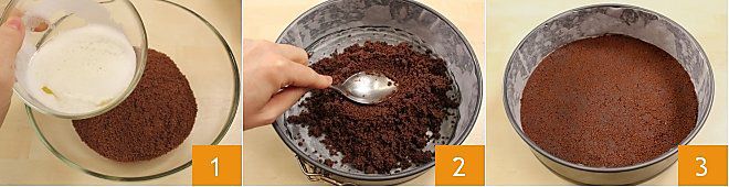 Para preparar a cheesecake floresta negra, comece preparando a base: coloque os biscoitos secos de cacau no processador, triture-os finamente e transfira para uma tigela. Derreta a manteiga em uma panela ou no micro-ondas e adicione-a aos poucos aos biscoitos 1, mexendo para misturar bem tudo. Unte uma forma, de preferência com aro removível, com 22 cm de diâmetro e forre-a com papel manteiga (para ver como fazer, veja aqui nossa Escola de Cozinha: forrar uma forma com papel manteiga). Despeje os biscoitos triturados na forma e, com as costas de uma colher, compacte bem a base de biscoito 2. Deixe a base esfriar 3 na geladeira por meia hora ou no freezer por 15 minutos.