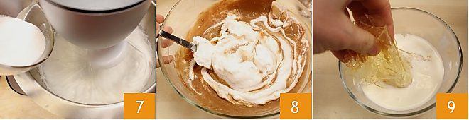 Bata as claras em neve com o açúcar restante (50 g) 7 e quando estiverem firmes, adicione-as ao creme de chocolate, mexendo a mistura com uma espátula de baixo para cima, para não desmontar as claras 8. Amoleça 12 g de gelatina em água fria por 10 minutos, escorra e derreta em 2 colheres de sopa de creme de leite quente 9. Se você quiser saber mais sobre o uso da gelatina, Como usar a gelatina incolor nossa Escola de Cozinha: como usar a gelatina.